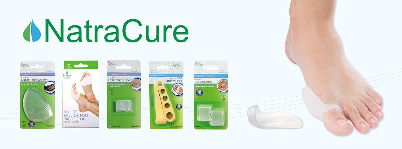 NatraCure erbjuder högkvalitativa medicinska fotvårdsprodukter som behandlar, lindrar och hjälper till vid vanliga fotproblem. NatraCures produkter kan användas vid hallux valgus, hälsporre, förfotssmärta, hammartå, blåsor och liktornar. Produkterna innehåller en unik gel som har återfuktande egenskaper och är både mjuk, smidig och slitstark. NatraCures produkter är anatomiskt utformade för bästa passform, CE-märkta och tvätt- och återanvändbara. I Apotek Hjärtats sortiment hittar du bland annat tåskiljare, tådelare, förfotsskydd, tåstöd och gelsulor. Köp medicinska fotprodukter från NatraCure online hos Apotek Hjärtat.